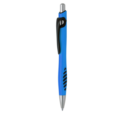 Plastic ballpoint pen, slim plastic refill, blue ink.
