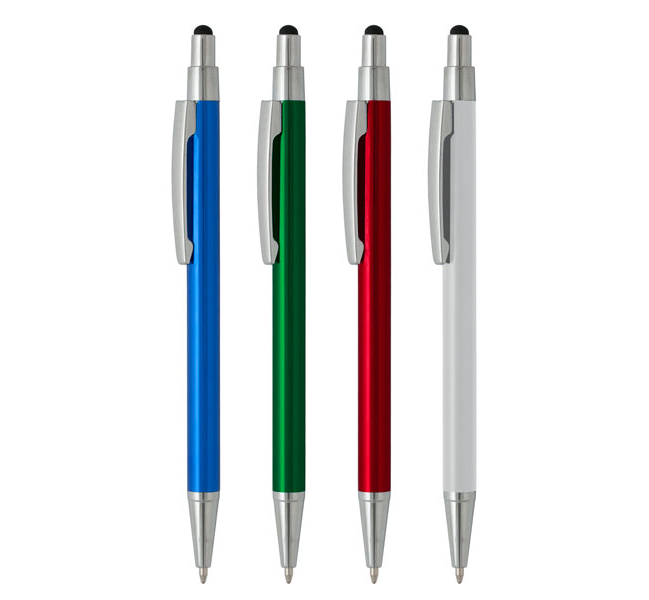 Stylus pen, slim plastic refill, blue ink.