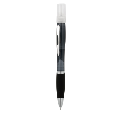 Ballpoint pen with a refillable sprayer and protective cap on top.