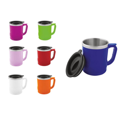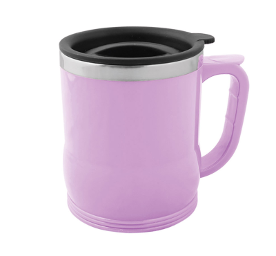 400 ml travel mug with stainless steel inner tank and plastic handle and lid.
