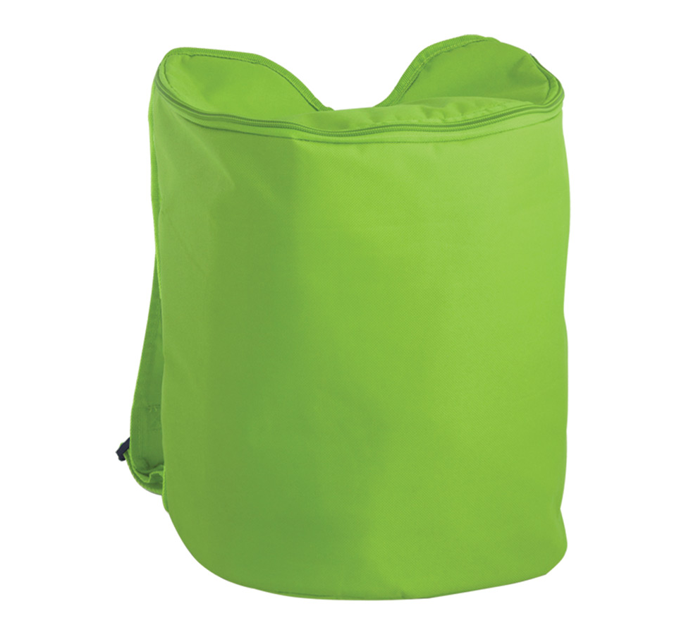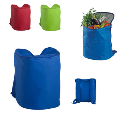 Polyester cooler backpack with zipped main compartment and adjustable shoulder strap.
