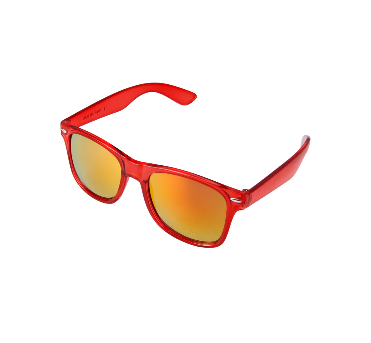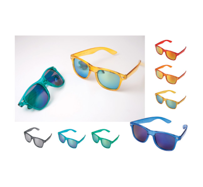 Reflective sunglasses with colourful plastic frame and UV400 protection lens.
