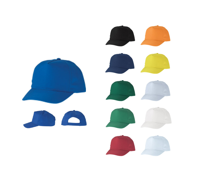 5-panel polyester cap, 4 embroidered eyelets for ventilation, velcro back closure.