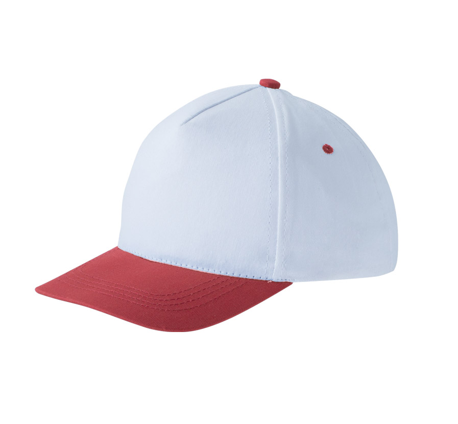 5-panel cotton cap, 4 embroidered eyelets for ventilation, velcro back closure.