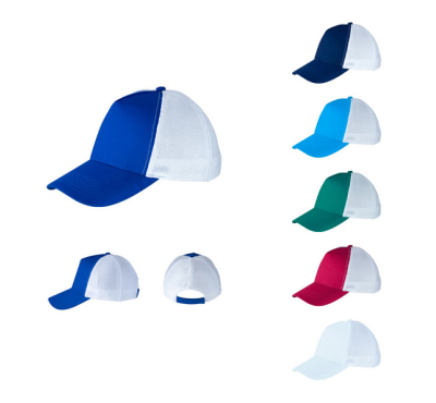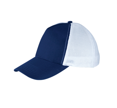5-panel polyester and mesh cap, 4 embroidered eyelets for ventilation, velcro back closure.