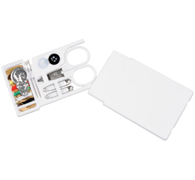 Sewing kit in plastic case.