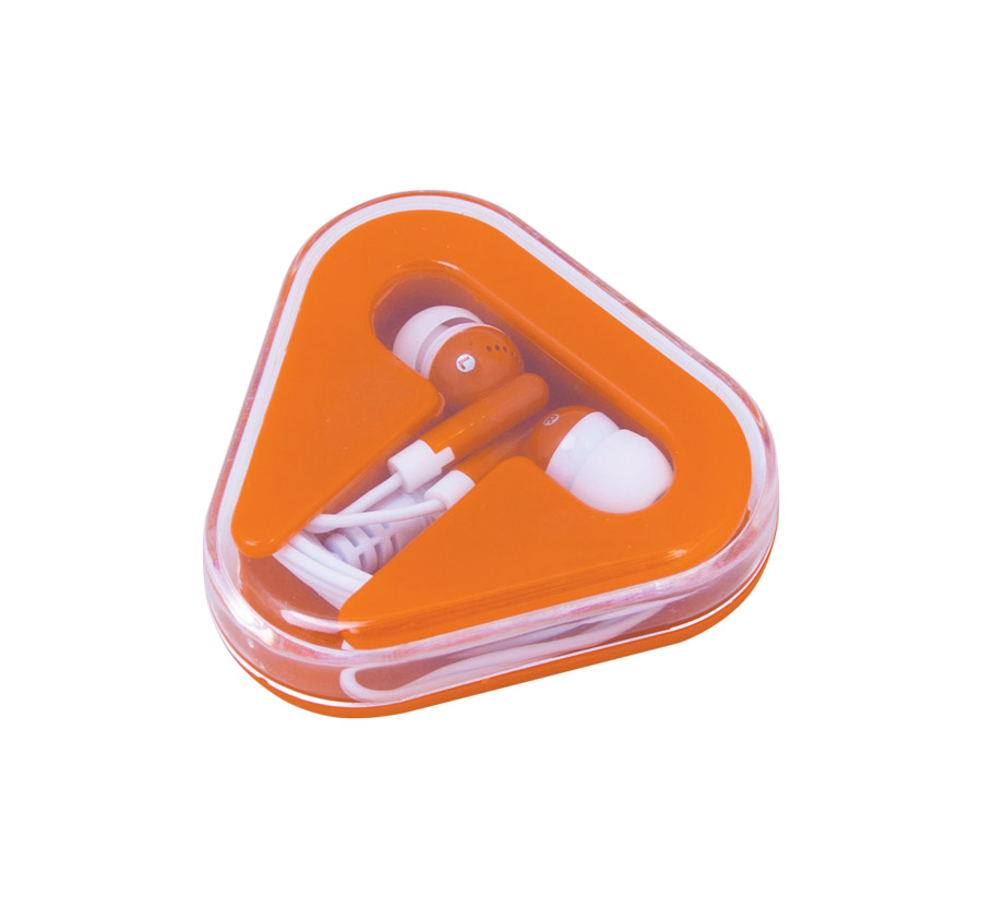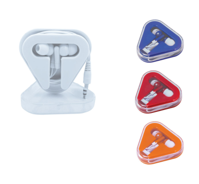 Earphones for smartphone and tablet. Supplied in a plastic triangular case with cable storage.