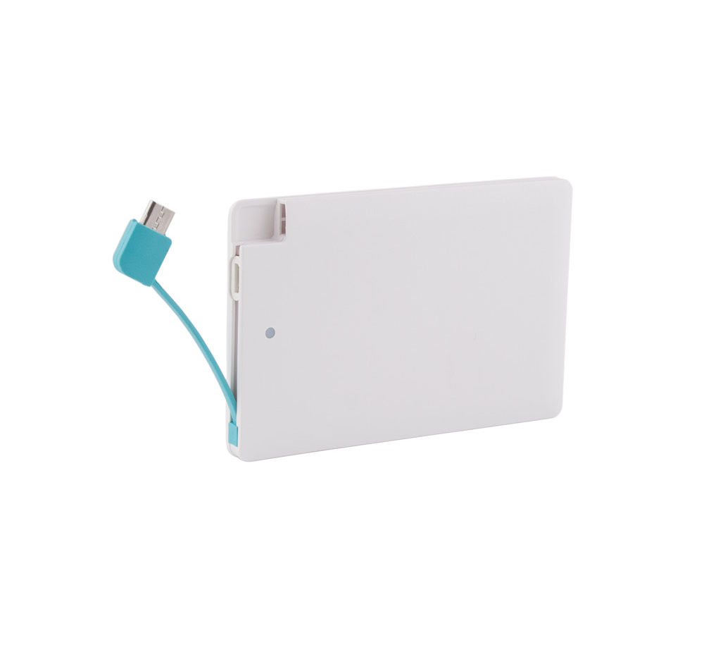 Външна батерия, капацитет 2500 mAh, включен кабел за зареждане и накрайник за iPhone.