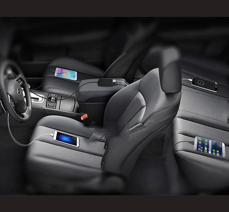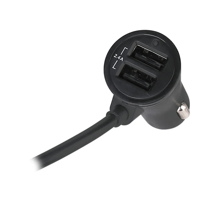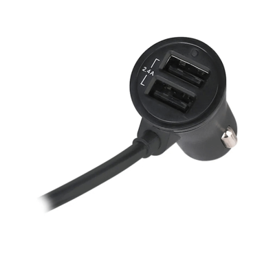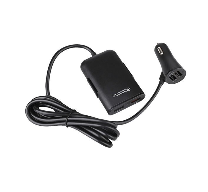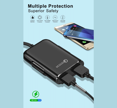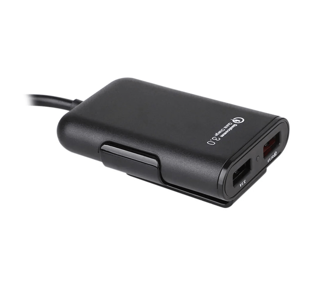4-Port fast USB car charger with extension cable. Clip for hanging.