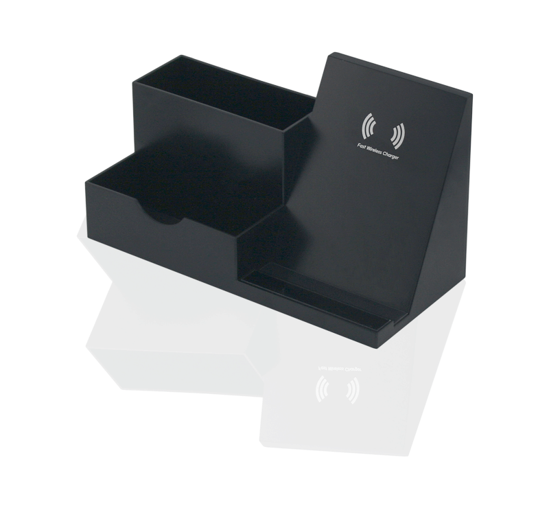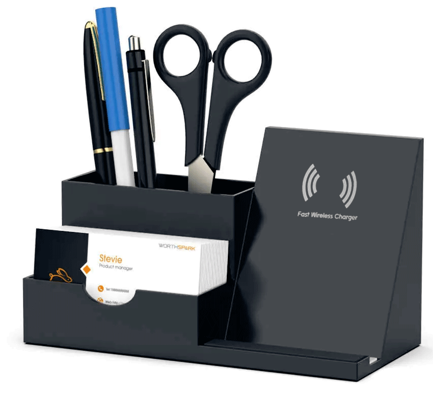 Мултифункционална поставка за бюро с безжично зарядно, стойка за телефон, място за химикалки и визитки.