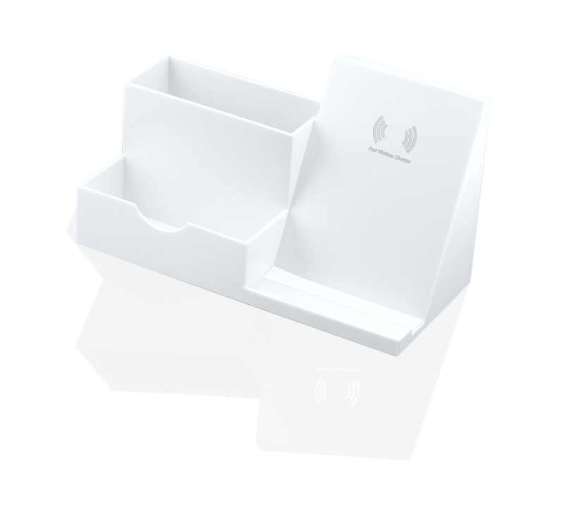 Мултифункционална поставка за бюро с безжично зарядно, стойка за телефон, място за химикалки и визитки.